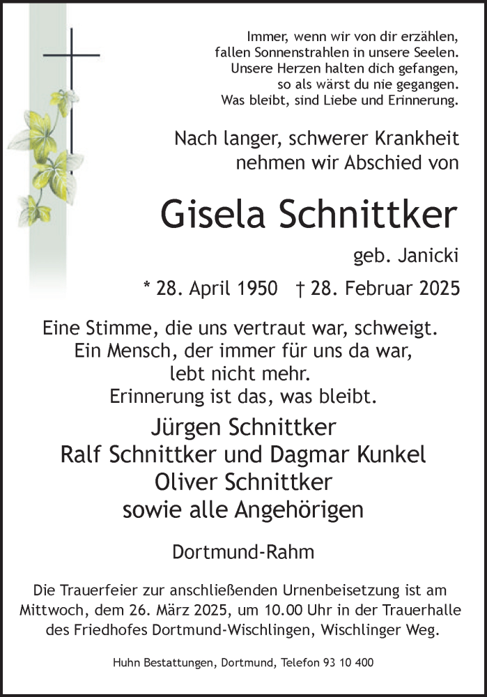 Hier finden Sie alle Traueranzeigen aus der Zeitung, die bisher für Gisela Schnittker erschienen sind. Weitere Traueranzeigen, die in der Zeitung erscheinen, werden hier ebenfalls aufgelistet