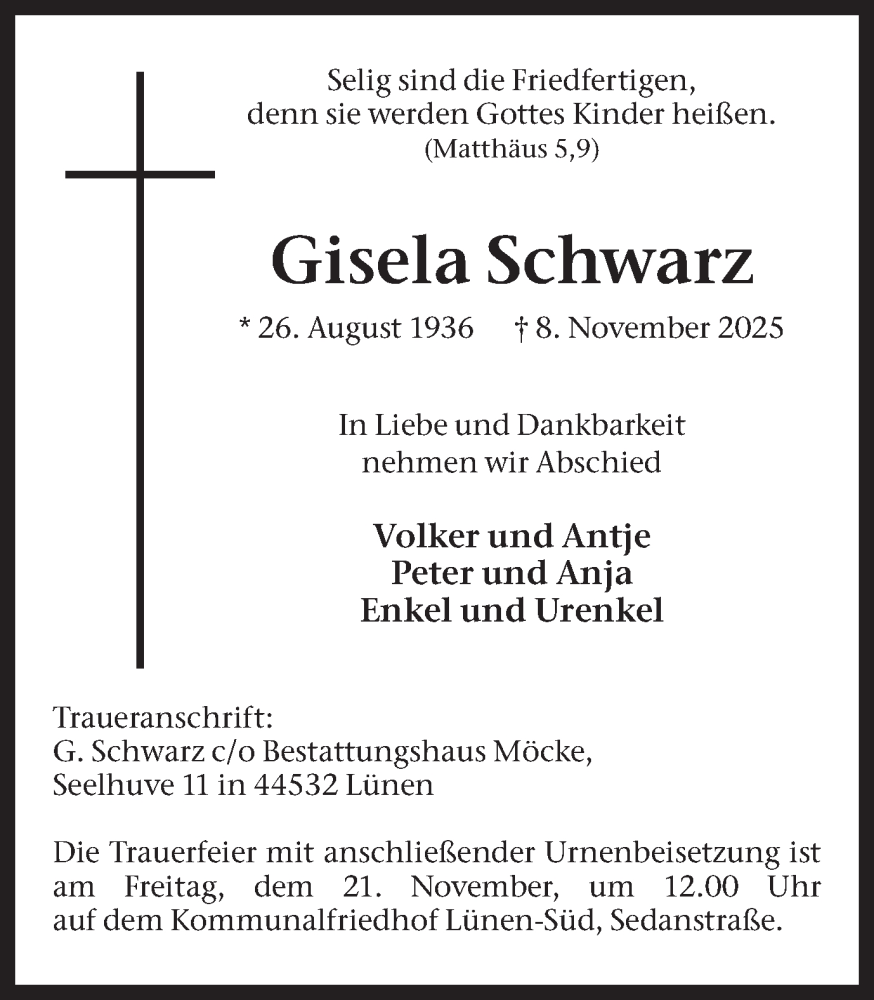 Hier finden Sie alle Traueranzeigen aus der Zeitung, die bisher für Gisela Schwarz erschienen sind. Weitere Traueranzeigen, die in der Zeitung erscheinen, werden hier ebenfalls aufgelistet