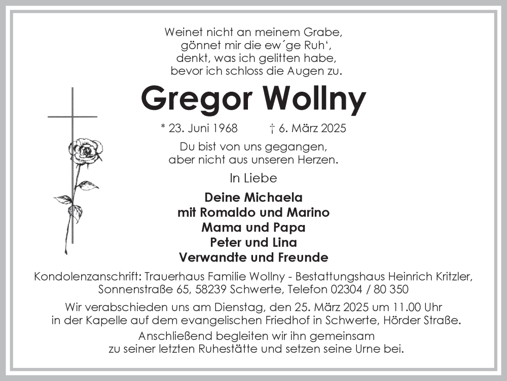 Hier finden Sie alle Traueranzeigen aus der Zeitung, die bisher für Gregor Wollny erschienen sind. Weitere Traueranzeigen, die in der Zeitung erscheinen, werden hier ebenfalls aufgelistet