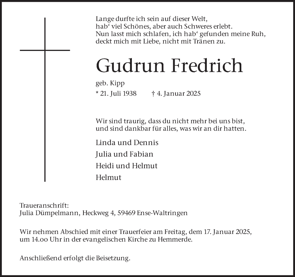 Hier finden Sie alle Traueranzeigen aus der Zeitung, die bisher für Gudrun Fredrich erschienen sind. Weitere Traueranzeigen, die in der Zeitung erscheinen, werden hier ebenfalls aufgelistet