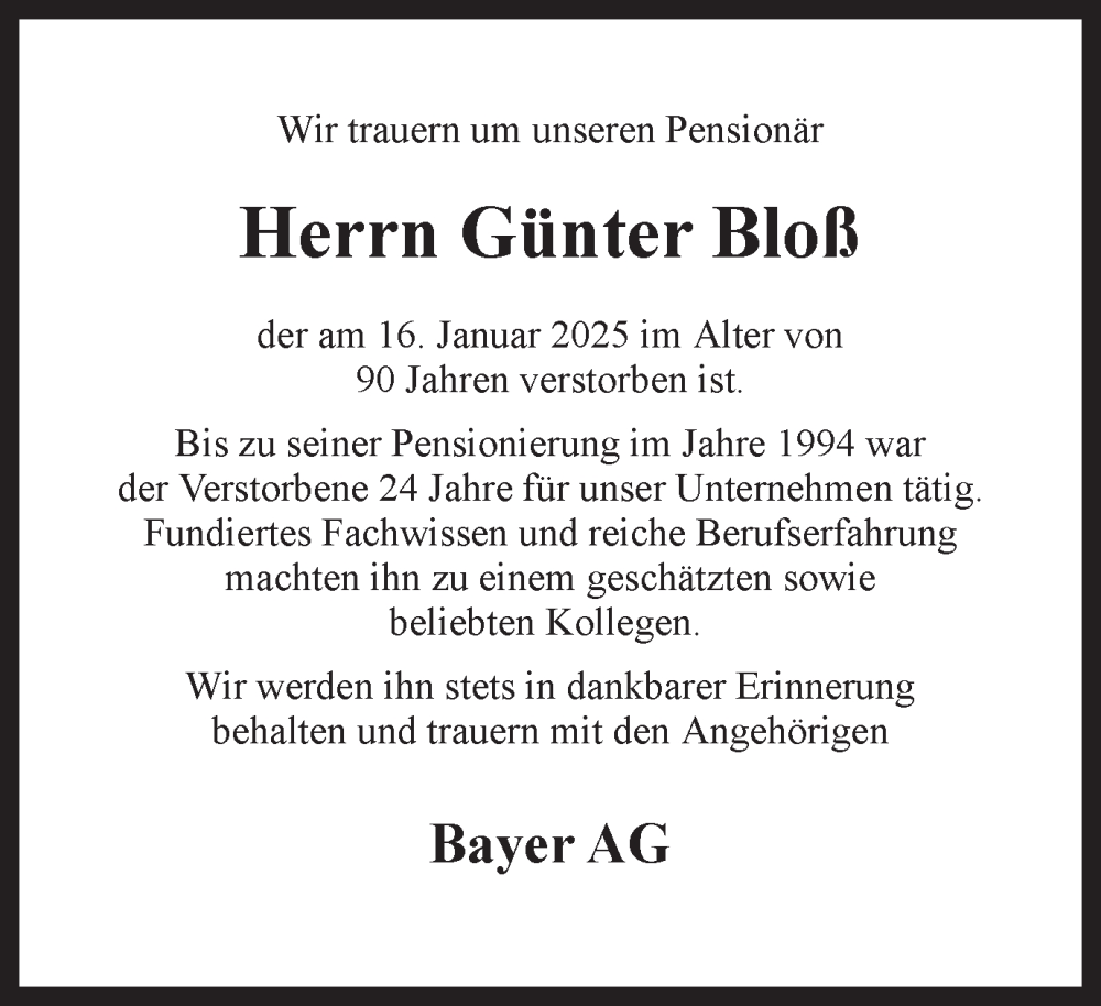 Hier finden Sie alle Traueranzeigen aus der Zeitung, die bisher für Günter Bloß erschienen sind. Weitere Traueranzeigen, die in der Zeitung erscheinen, werden hier ebenfalls aufgelistet