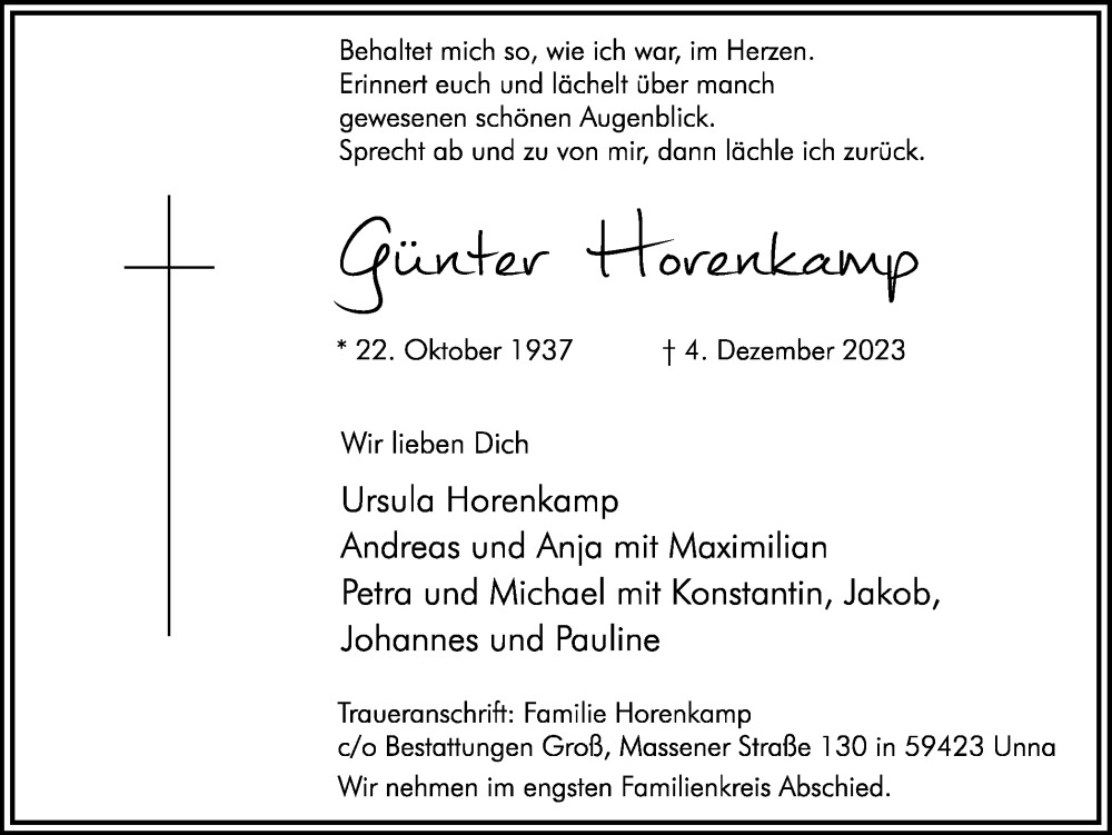 Hier finden Sie alle Traueranzeigen aus der Zeitung, die bisher für Günter Horenkamp erschienen sind. Weitere Traueranzeigen, die in der Zeitung erscheinen, werden hier ebenfalls aufgelistet