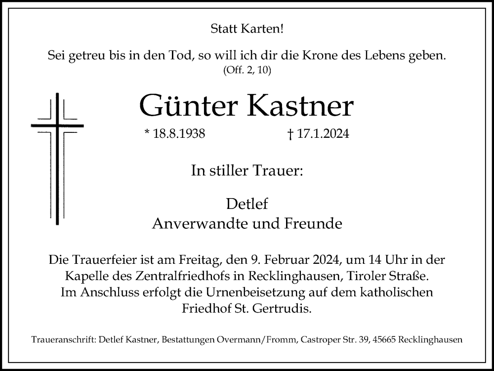 Hier finden Sie alle Traueranzeigen aus der Zeitung, die bisher für Günter Kastner erschienen sind. Weitere Traueranzeigen, die in der Zeitung erscheinen, werden hier ebenfalls aufgelistet