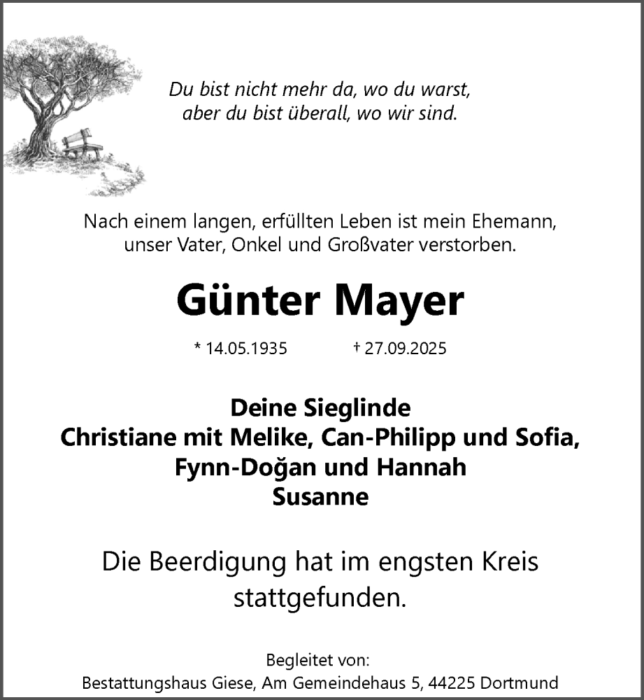 Hier finden Sie alle Traueranzeigen aus der Zeitung, die bisher für Günter Mayer erschienen sind. Weitere Traueranzeigen, die in der Zeitung erscheinen, werden hier ebenfalls aufgelistet