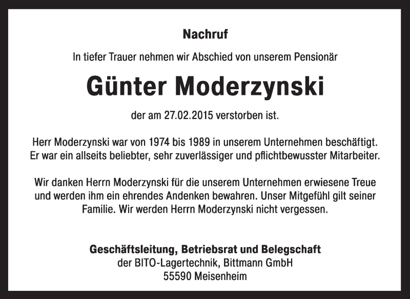 Hier finden Sie alle Traueranzeigen aus der Zeitung, die bisher für Günter Moderzynski erschienen sind. Weitere Traueranzeigen, die in der Zeitung erscheinen, werden hier ebenfalls aufgelistet