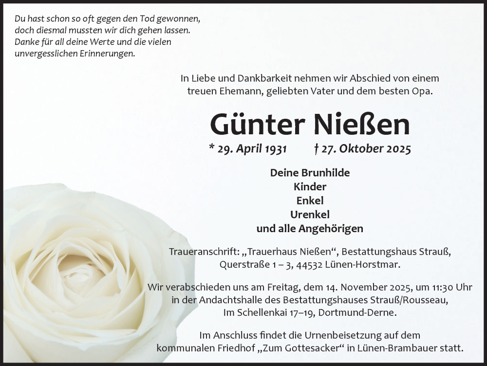 Hier finden Sie alle Traueranzeigen aus der Zeitung, die bisher für Günter Nießen erschienen sind. Weitere Traueranzeigen, die in der Zeitung erscheinen, werden hier ebenfalls aufgelistet