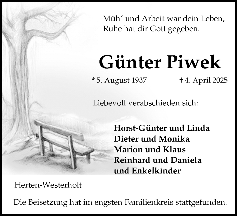 Hier finden Sie alle Traueranzeigen aus der Zeitung, die bisher für Günter Piwek erschienen sind. Weitere Traueranzeigen, die in der Zeitung erscheinen, werden hier ebenfalls aufgelistet