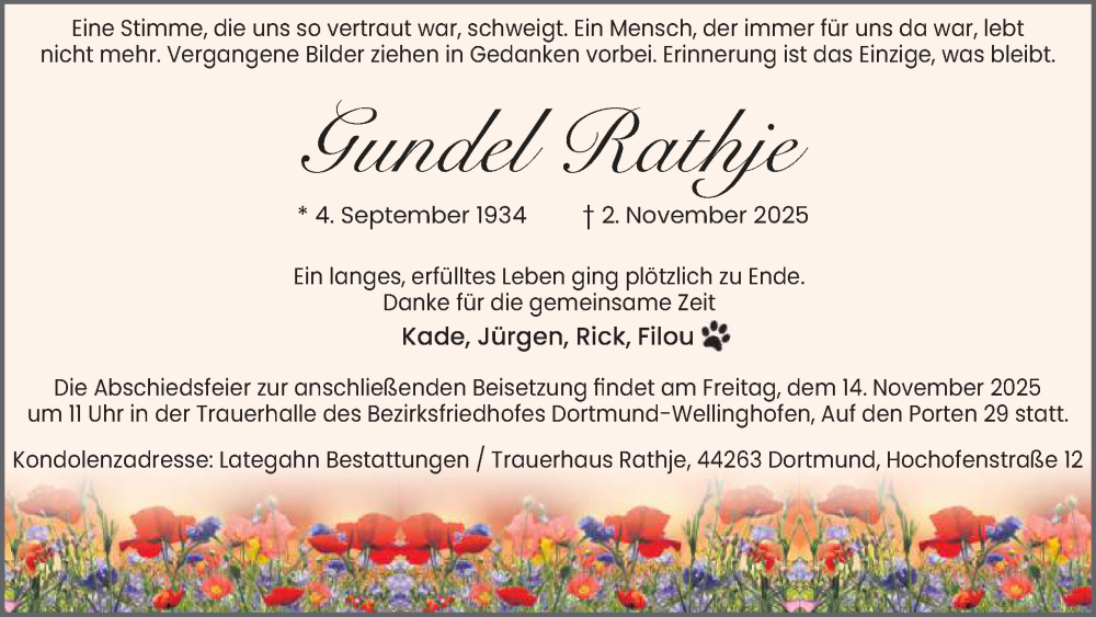 Hier finden Sie alle Traueranzeigen aus der Zeitung, die bisher für Gundel Rathje erschienen sind. Weitere Traueranzeigen, die in der Zeitung erscheinen, werden hier ebenfalls aufgelistet