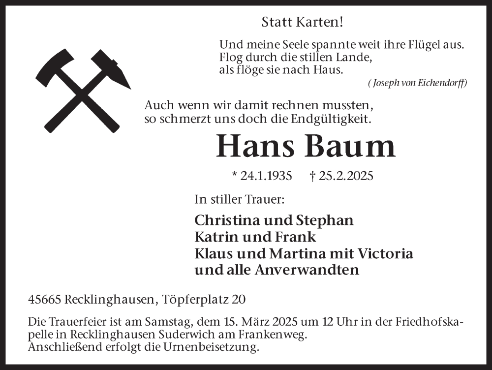 Hier finden Sie alle Traueranzeigen aus der Zeitung, die bisher für Hans Baum erschienen sind. Weitere Traueranzeigen, die in der Zeitung erscheinen, werden hier ebenfalls aufgelistet