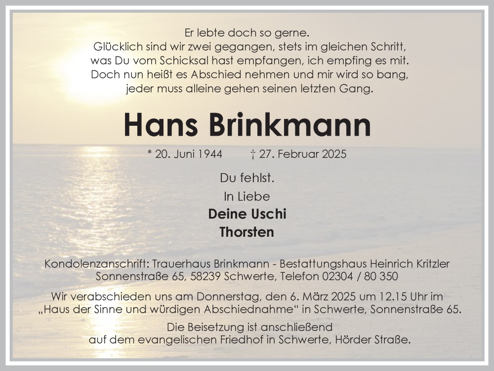 Hier finden Sie alle Traueranzeigen aus der Zeitung, die bisher für Hans Brinkmann erschienen sind. Weitere Traueranzeigen, die in der Zeitung erscheinen, werden hier ebenfalls aufgelistet