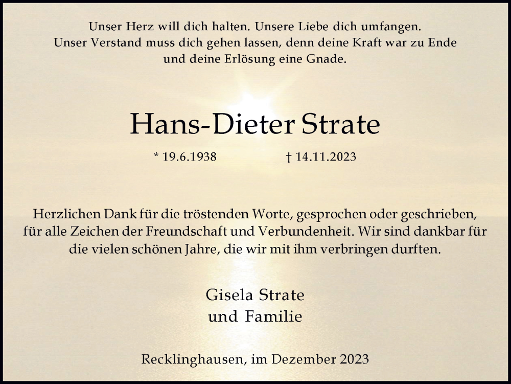 Hier finden Sie alle Traueranzeigen aus der Zeitung, die bisher für Hans-Dieter Strate erschienen sind. Weitere Traueranzeigen, die in der Zeitung erscheinen, werden hier ebenfalls aufgelistet