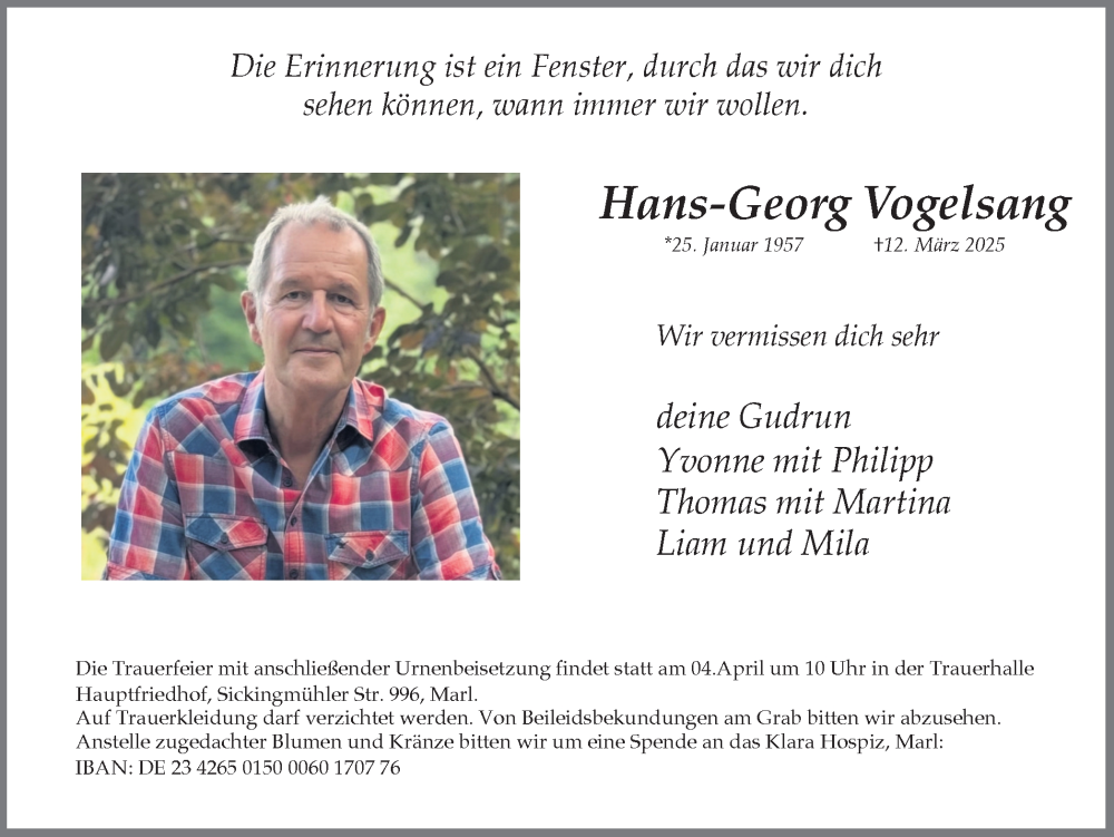 Hier finden Sie alle Traueranzeigen aus der Zeitung, die bisher für Hans-Georg Vogelsang erschienen sind. Weitere Traueranzeigen, die in der Zeitung erscheinen, werden hier ebenfalls aufgelistet