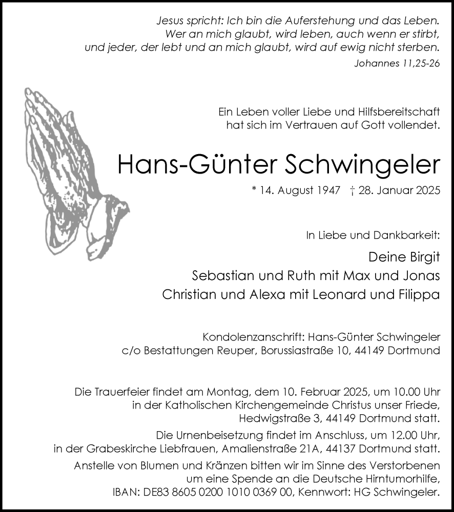 Hier finden Sie alle Traueranzeigen aus der Zeitung, die bisher für Hans-Günter Schwingeler erschienen sind. Weitere Traueranzeigen, die in der Zeitung erscheinen, werden hier ebenfalls aufgelistet