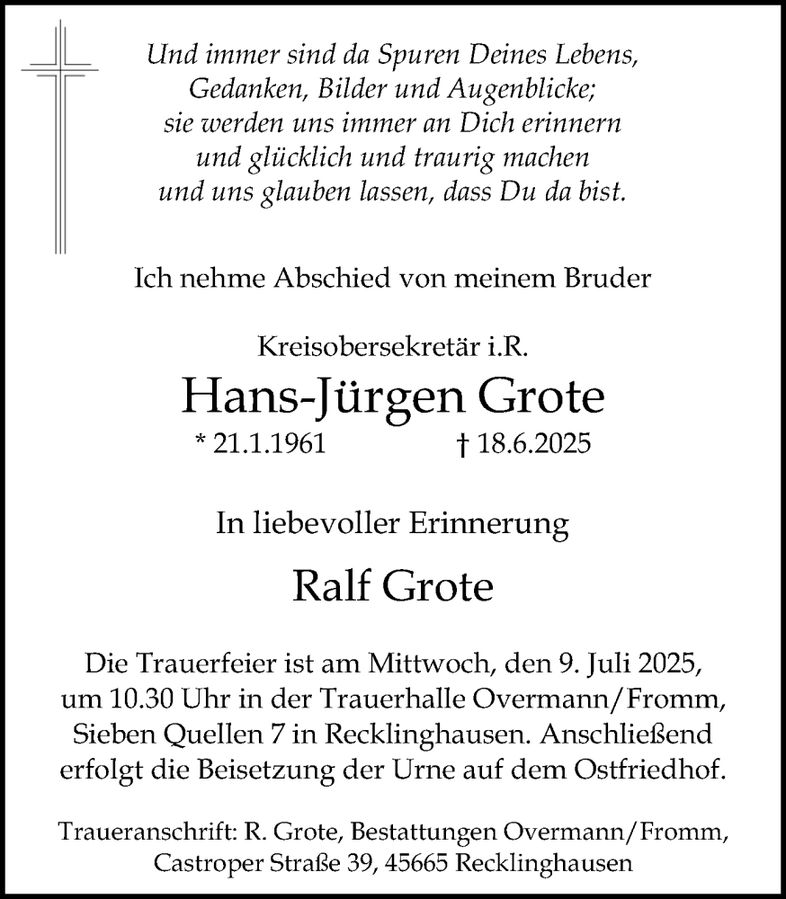Hier finden Sie alle Traueranzeigen aus der Zeitung, die bisher für Hans-Jürgen Grote erschienen sind. Weitere Traueranzeigen, die in der Zeitung erscheinen, werden hier ebenfalls aufgelistet