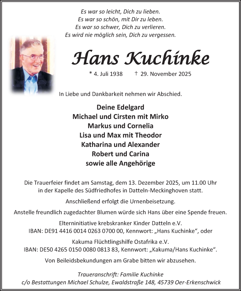 Hier finden Sie alle Traueranzeigen aus der Zeitung, die bisher für Hans Kuchinke erschienen sind. Weitere Traueranzeigen, die in der Zeitung erscheinen, werden hier ebenfalls aufgelistet