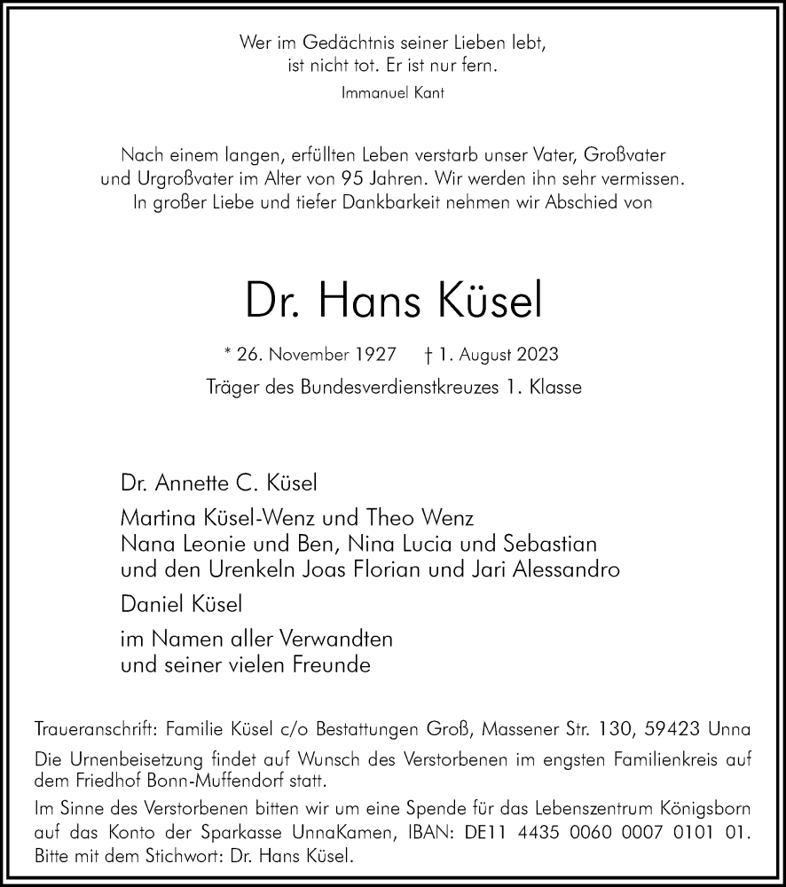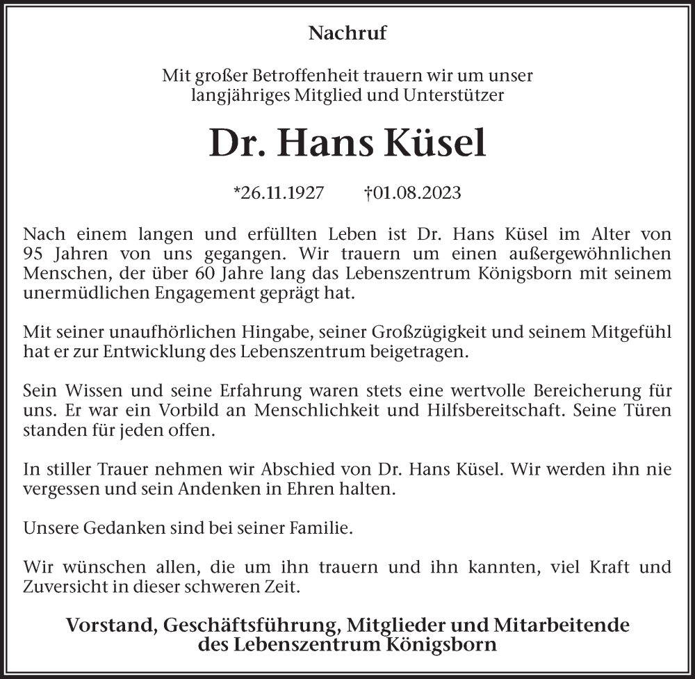 Hier finden Sie alle Traueranzeigen aus der Zeitung, die bisher für Hans Küsel erschienen sind. Weitere Traueranzeigen, die in der Zeitung erscheinen, werden hier ebenfalls aufgelistet