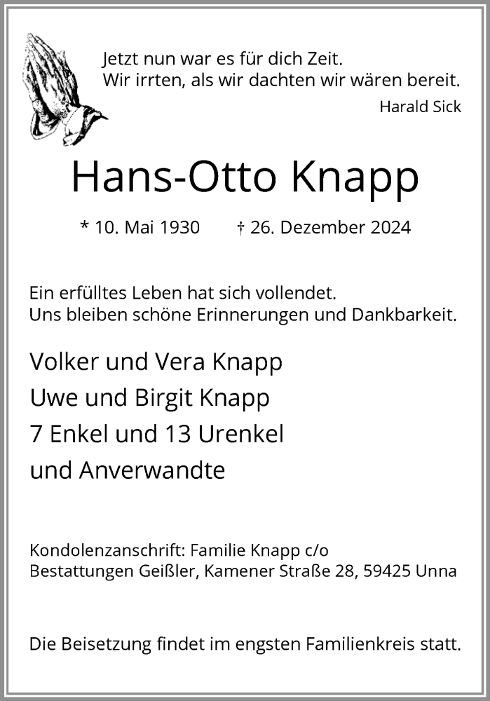 Hier finden Sie alle Traueranzeigen aus der Zeitung, die bisher für Hans-Otto Knapp erschienen sind. Weitere Traueranzeigen, die in der Zeitung erscheinen, werden hier ebenfalls aufgelistet