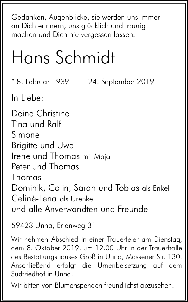 Hier finden Sie alle Traueranzeigen aus der Zeitung, die bisher für Hans Schmidt erschienen sind. Weitere Traueranzeigen, die in der Zeitung erscheinen, werden hier ebenfalls aufgelistet
