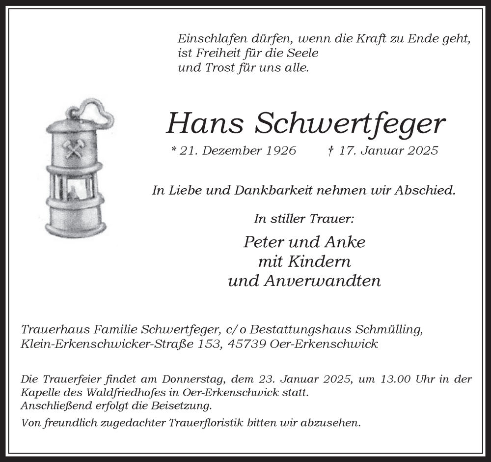 Hier finden Sie alle Traueranzeigen aus der Zeitung, die bisher für Hans Schwertfeger erschienen sind. Weitere Traueranzeigen, die in der Zeitung erscheinen, werden hier ebenfalls aufgelistet