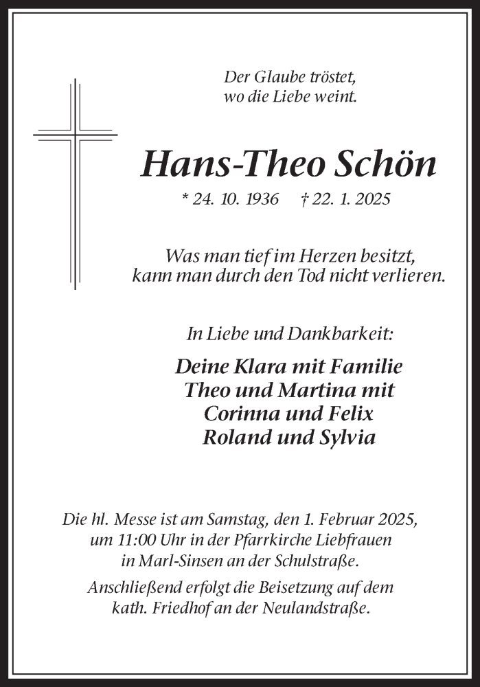 Hier finden Sie alle Traueranzeigen aus der Zeitung, die bisher für Hans-Theo Schön erschienen sind. Weitere Traueranzeigen, die in der Zeitung erscheinen, werden hier ebenfalls aufgelistet