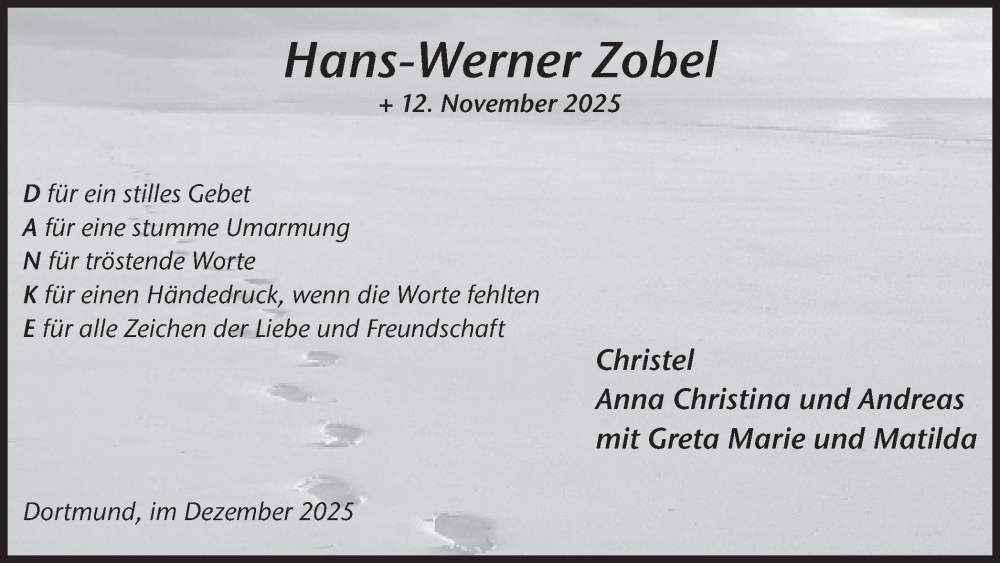 Hier finden Sie alle Traueranzeigen aus der Zeitung, die bisher für Hans-Werner Zobel erschienen sind. Weitere Traueranzeigen, die in der Zeitung erscheinen, werden hier ebenfalls aufgelistet