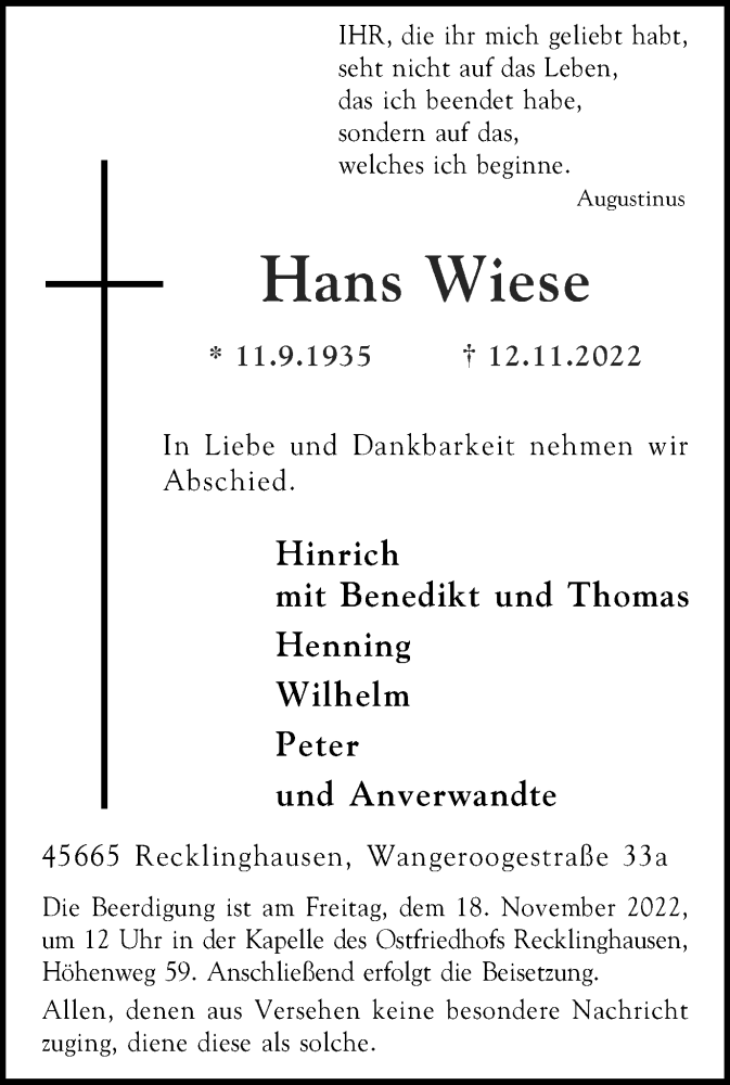 Hier finden Sie alle Traueranzeigen aus der Zeitung, die bisher für Hans Wiese erschienen sind. Weitere Traueranzeigen, die in der Zeitung erscheinen, werden hier ebenfalls aufgelistet