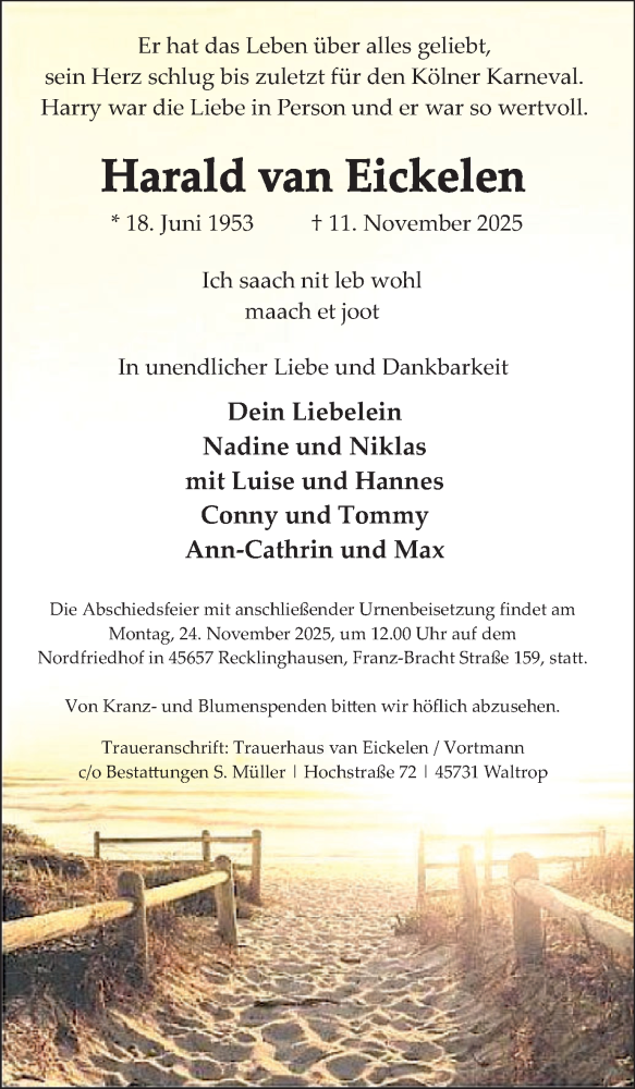 Hier finden Sie alle Traueranzeigen aus der Zeitung, die bisher für Harald van Eickelen erschienen sind. Weitere Traueranzeigen, die in der Zeitung erscheinen, werden hier ebenfalls aufgelistet