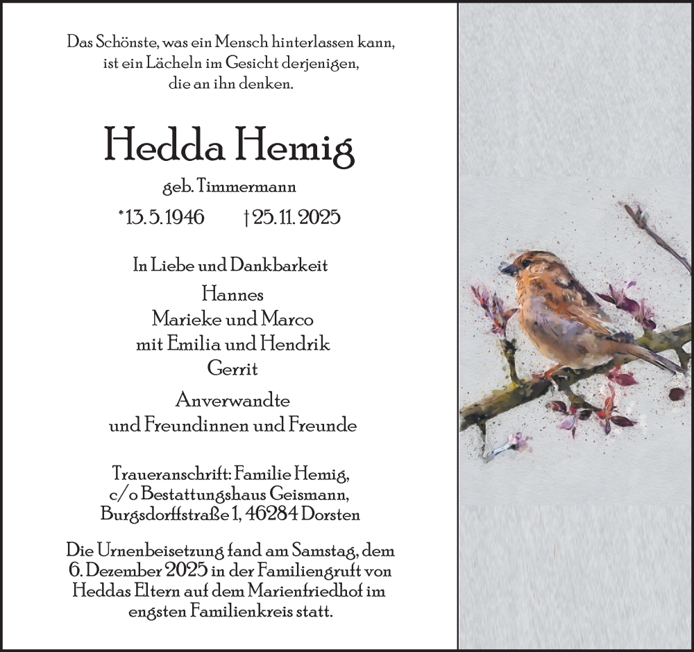 Hier finden Sie alle Traueranzeigen aus der Zeitung, die bisher für Hedda Hemig erschienen sind. Weitere Traueranzeigen, die in der Zeitung erscheinen, werden hier ebenfalls aufgelistet