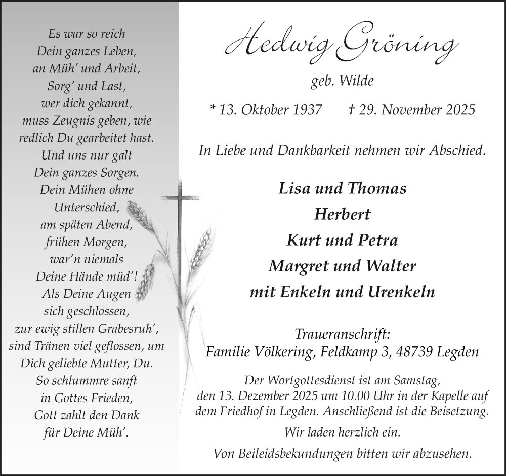 Hier finden Sie alle Traueranzeigen aus der Zeitung, die bisher für Hedwig Gröning erschienen sind. Weitere Traueranzeigen, die in der Zeitung erscheinen, werden hier ebenfalls aufgelistet