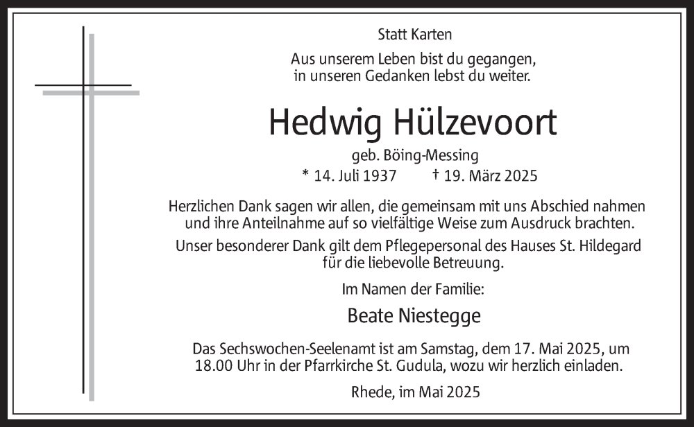Hier finden Sie alle Traueranzeigen aus der Zeitung, die bisher für Hedwig Hülzevoort erschienen sind. Weitere Traueranzeigen, die in der Zeitung erscheinen, werden hier ebenfalls aufgelistet