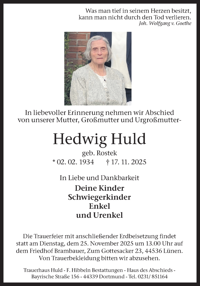Hier finden Sie alle Traueranzeigen aus der Zeitung, die bisher für Hedwig Huld erschienen sind. Weitere Traueranzeigen, die in der Zeitung erscheinen, werden hier ebenfalls aufgelistet
