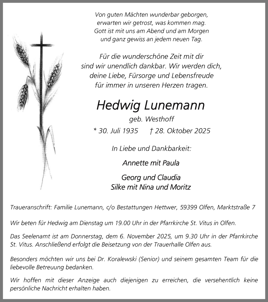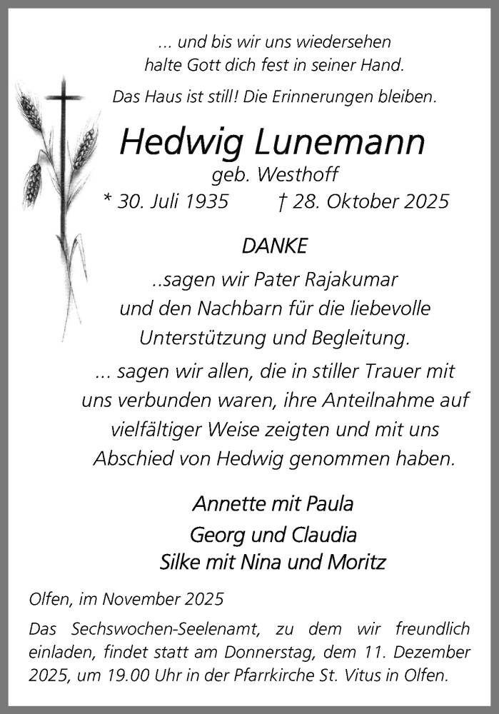 Hier finden Sie alle Traueranzeigen aus der Zeitung, die bisher für Hedwig Lunemann erschienen sind. Weitere Traueranzeigen, die in der Zeitung erscheinen, werden hier ebenfalls aufgelistet