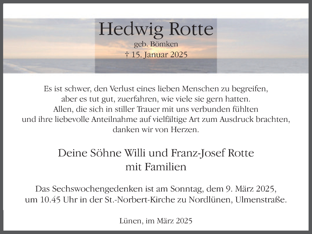 Hier finden Sie alle Traueranzeigen aus der Zeitung, die bisher für Hedwig Rotte erschienen sind. Weitere Traueranzeigen, die in der Zeitung erscheinen, werden hier ebenfalls aufgelistet