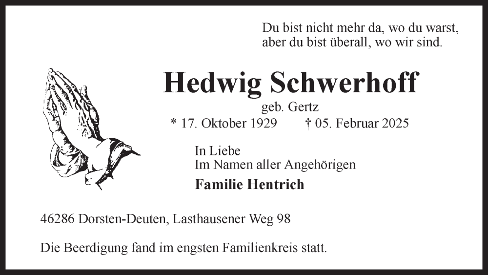Hier finden Sie alle Traueranzeigen aus der Zeitung, die bisher für Hedwig Schwerhoff erschienen sind. Weitere Traueranzeigen, die in der Zeitung erscheinen, werden hier ebenfalls aufgelistet