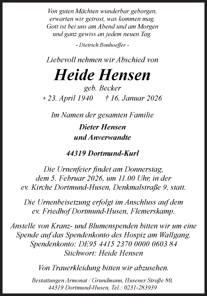 Hier finden Sie alle Traueranzeigen aus der Zeitung, die bisher für Heide Hensen erschienen sind. Weitere Traueranzeigen, die in der Zeitung erscheinen, werden hier ebenfalls aufgelistet