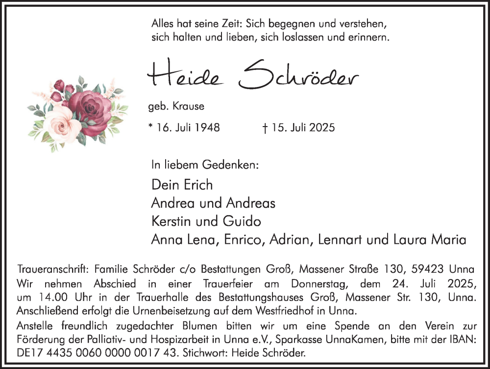 Hier finden Sie alle Traueranzeigen aus der Zeitung, die bisher für Heide Schröder erschienen sind. Weitere Traueranzeigen, die in der Zeitung erscheinen, werden hier ebenfalls aufgelistet