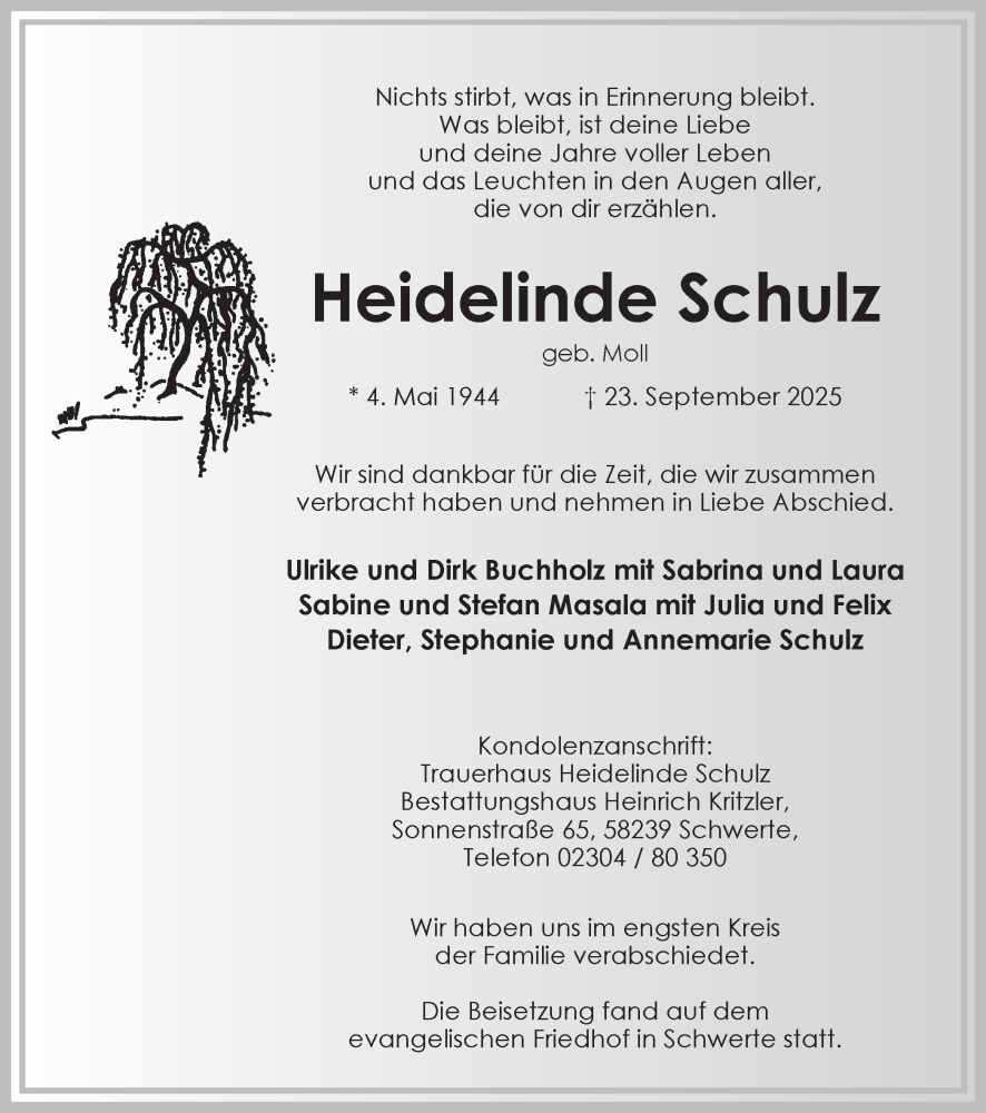 Hier finden Sie alle Traueranzeigen aus der Zeitung, die bisher für Heidelinde Schulz erschienen sind. Weitere Traueranzeigen, die in der Zeitung erscheinen, werden hier ebenfalls aufgelistet