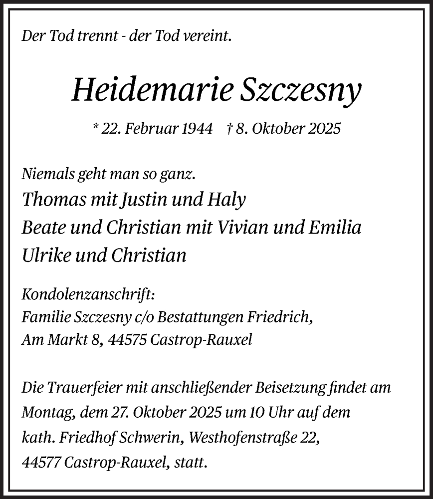 Hier finden Sie alle Traueranzeigen aus der Zeitung, die bisher für Heidemarie Szczesny erschienen sind. Weitere Traueranzeigen, die in der Zeitung erscheinen, werden hier ebenfalls aufgelistet