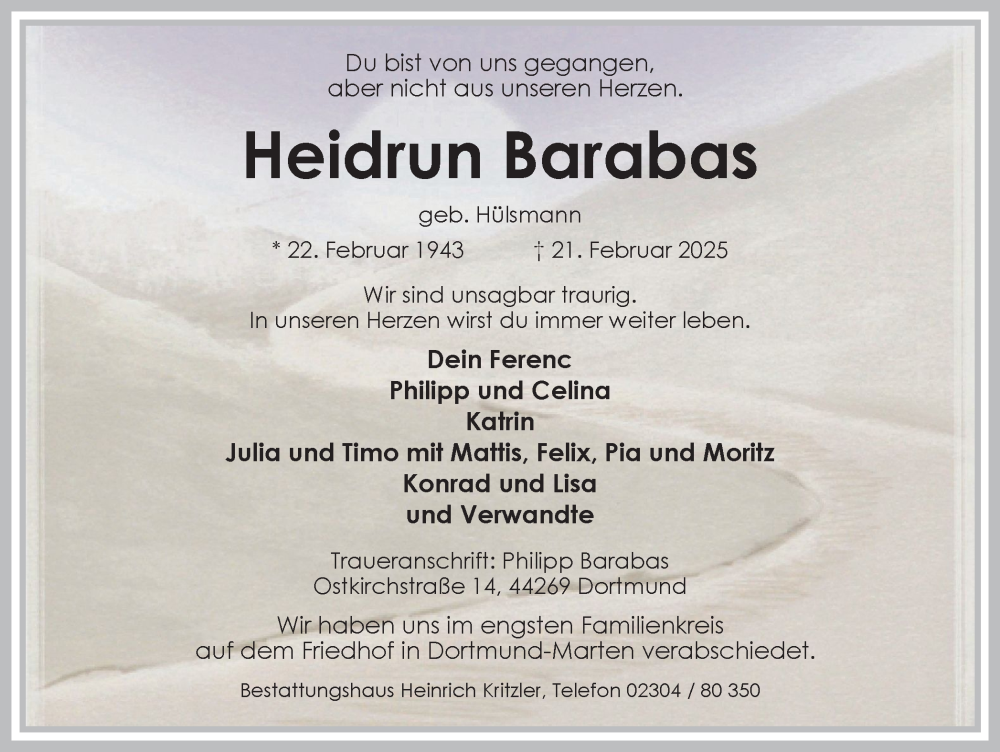 Hier finden Sie alle Traueranzeigen aus der Zeitung, die bisher für Heidrun Barabas erschienen sind. Weitere Traueranzeigen, die in der Zeitung erscheinen, werden hier ebenfalls aufgelistet