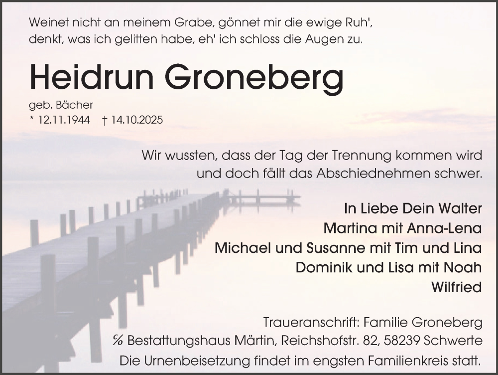 Hier finden Sie alle Traueranzeigen aus der Zeitung, die bisher für Heidrun Groneberg erschienen sind. Weitere Traueranzeigen, die in der Zeitung erscheinen, werden hier ebenfalls aufgelistet