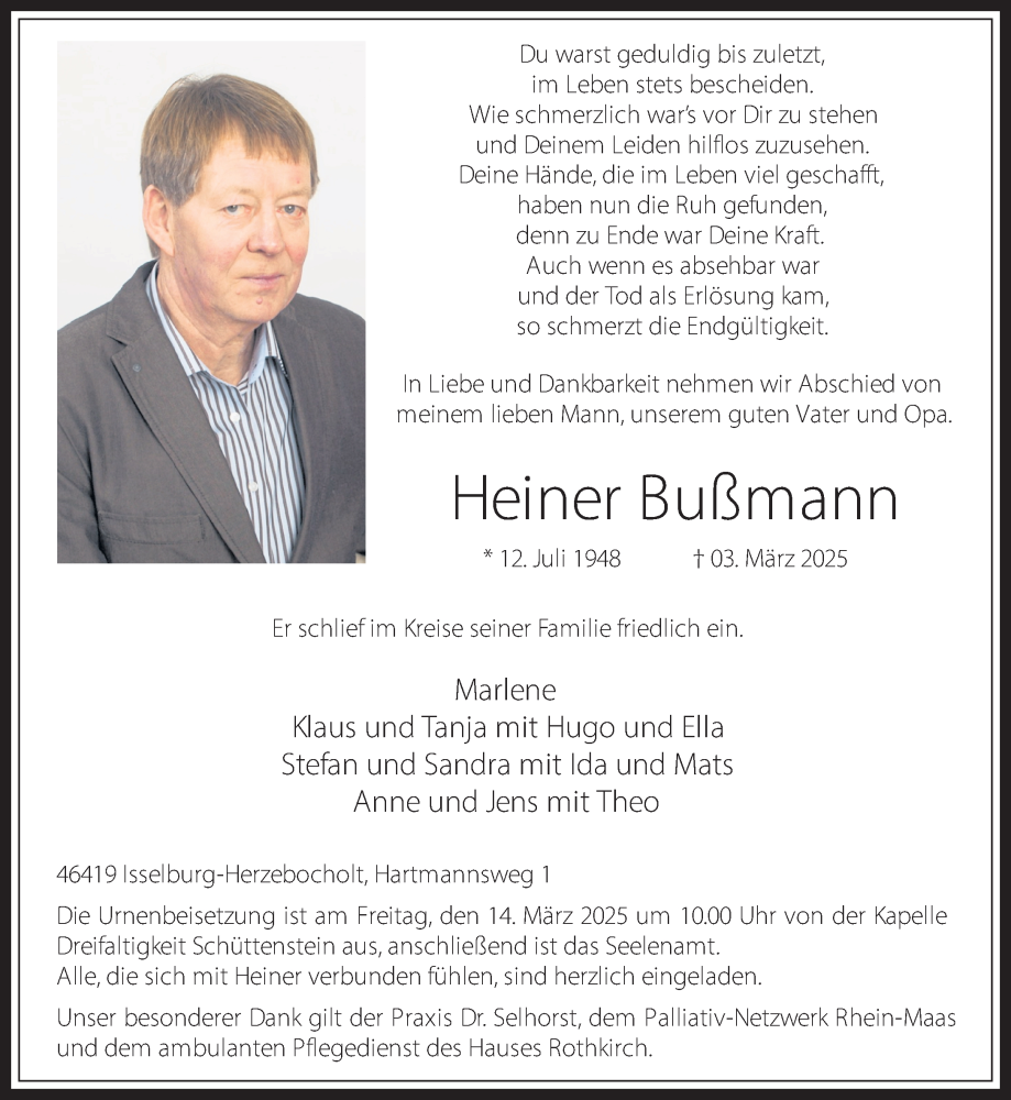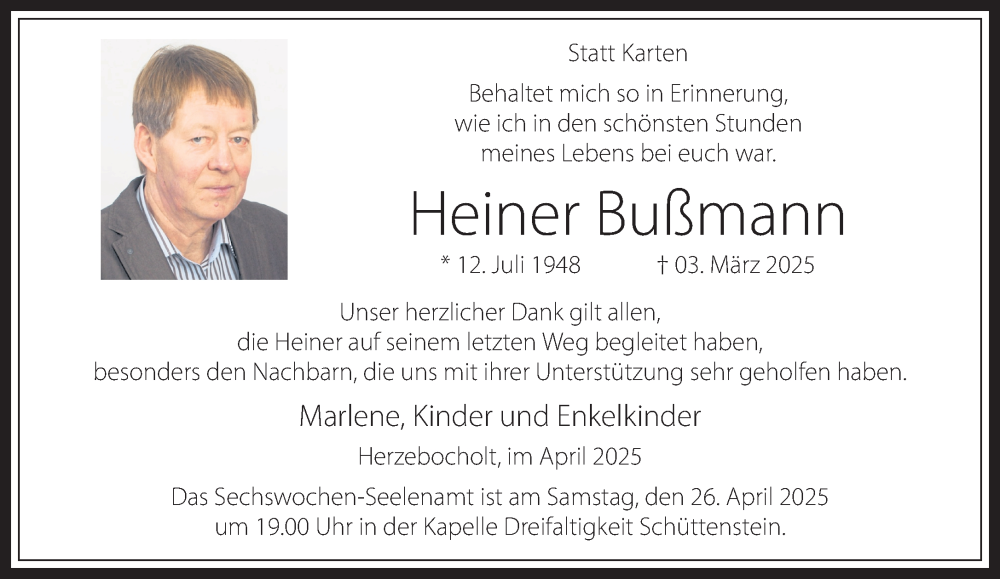 Hier finden Sie alle Traueranzeigen aus der Zeitung, die bisher für Heiner Bußmann erschienen sind. Weitere Traueranzeigen, die in der Zeitung erscheinen, werden hier ebenfalls aufgelistet