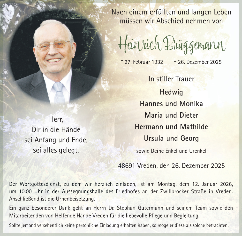 Hier finden Sie alle Traueranzeigen aus der Zeitung, die bisher für Heinrich Brüggemann erschienen sind. Weitere Traueranzeigen, die in der Zeitung erscheinen, werden hier ebenfalls aufgelistet