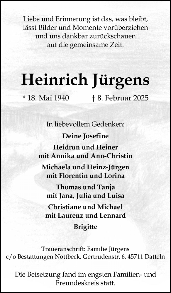 Hier finden Sie alle Traueranzeigen aus der Zeitung, die bisher für Heinrich Jürgens erschienen sind. Weitere Traueranzeigen, die in der Zeitung erscheinen, werden hier ebenfalls aufgelistet