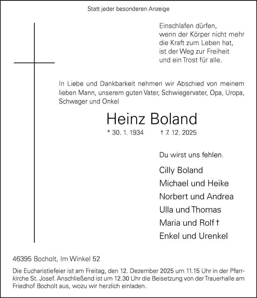 Hier finden Sie alle Traueranzeigen aus der Zeitung, die bisher für Heinz Boland erschienen sind. Weitere Traueranzeigen, die in der Zeitung erscheinen, werden hier ebenfalls aufgelistet