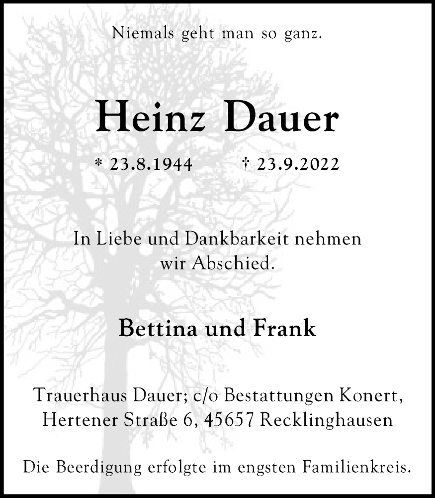 Hier finden Sie alle Traueranzeigen aus der Zeitung, die bisher für Heinz Dauer erschienen sind. Weitere Traueranzeigen, die in der Zeitung erscheinen, werden hier ebenfalls aufgelistet