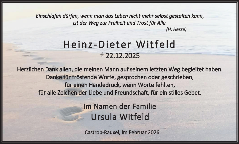 Hier finden Sie alle Traueranzeigen aus der Zeitung, die bisher für Heinz-Dieter Witfeld erschienen sind. Weitere Traueranzeigen, die in der Zeitung erscheinen, werden hier ebenfalls aufgelistet
