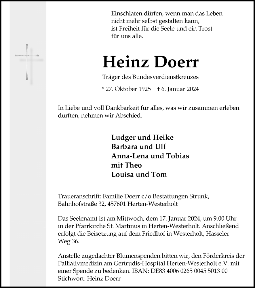Hier finden Sie alle Traueranzeigen aus der Zeitung, die bisher für Heinz Doerr erschienen sind. Weitere Traueranzeigen, die in der Zeitung erscheinen, werden hier ebenfalls aufgelistet