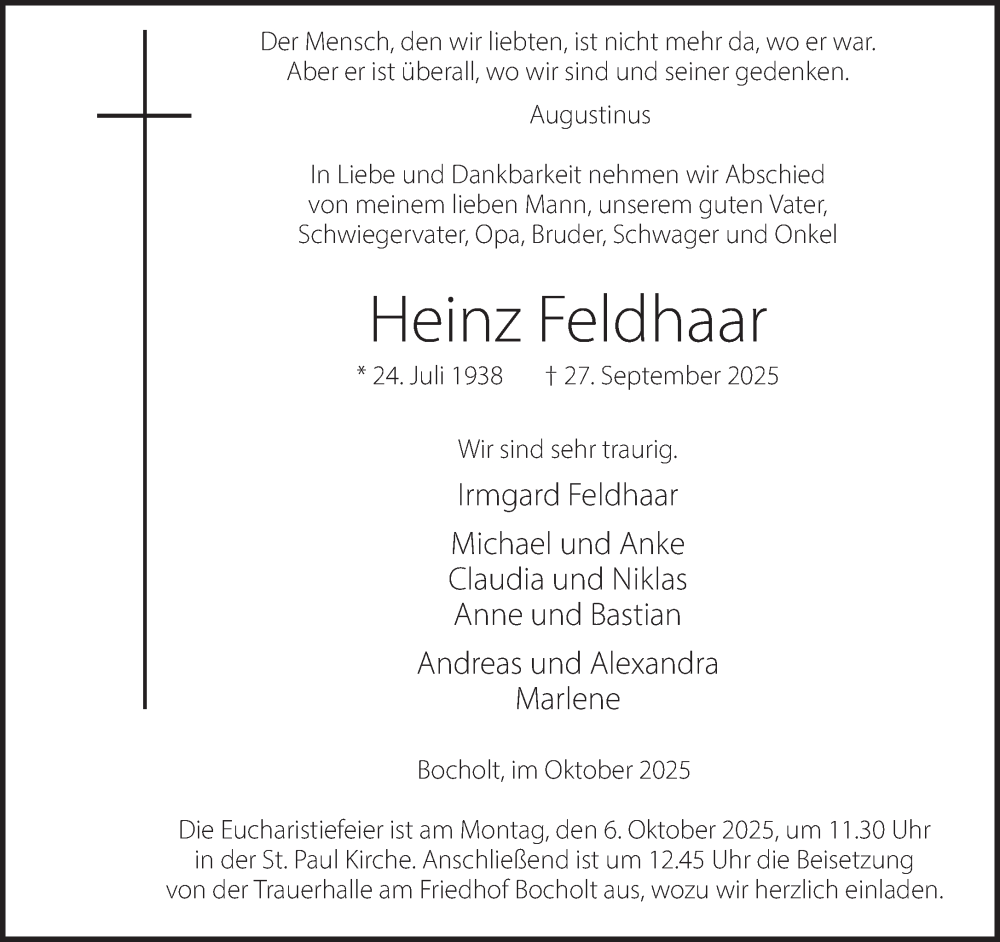 Hier finden Sie alle Traueranzeigen aus der Zeitung, die bisher für Heinz Feldhaar erschienen sind. Weitere Traueranzeigen, die in der Zeitung erscheinen, werden hier ebenfalls aufgelistet