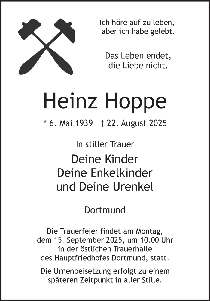 Hier finden Sie alle Traueranzeigen aus der Zeitung, die bisher für Heinz Hoppe erschienen sind. Weitere Traueranzeigen, die in der Zeitung erscheinen, werden hier ebenfalls aufgelistet