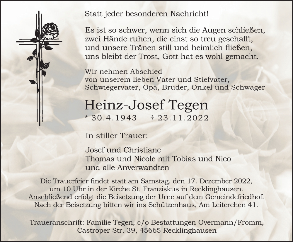 Hier finden Sie alle Traueranzeigen aus der Zeitung, die bisher für Heinz-Josef Tegen erschienen sind. Weitere Traueranzeigen, die in der Zeitung erscheinen, werden hier ebenfalls aufgelistet